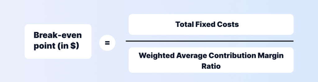 To find your break-even point in money, you divide your total fixed costs by your average profit per sale across all products — or, if you sell multiple items, you can weigh them by their contribution to overall profit.
